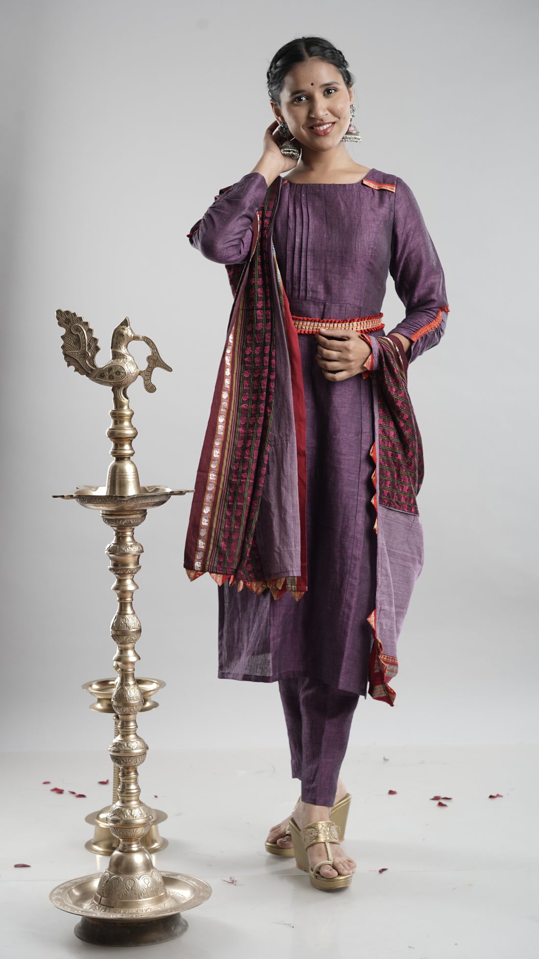 Linen Kurta Pant Dupatta Belt Set- Purple
