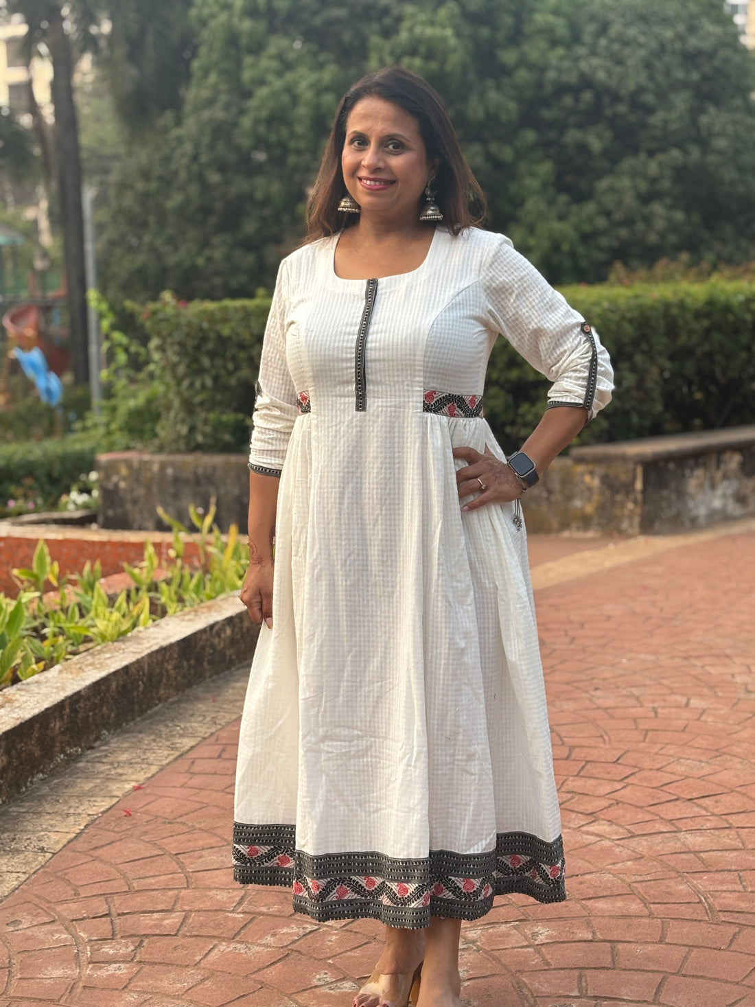 White Handloom Check Cotton Anarkali Dress