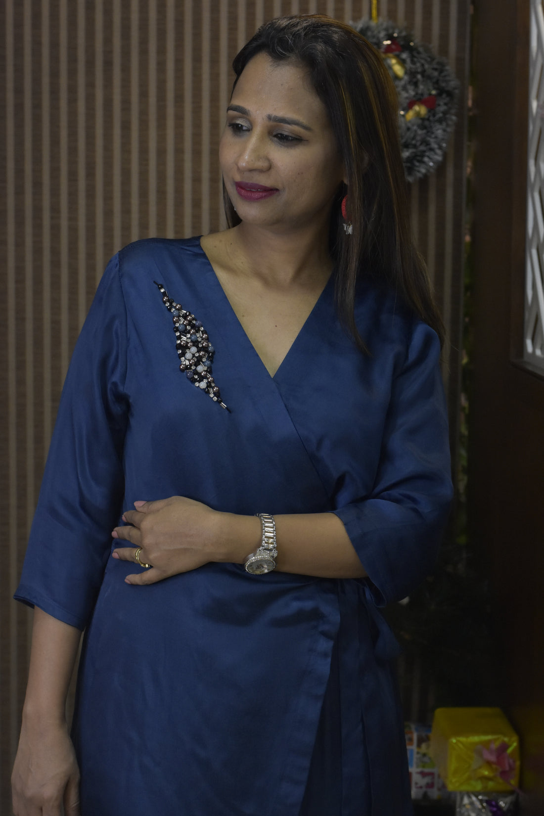 Modal Silk Wrap Around Dress- Blue
