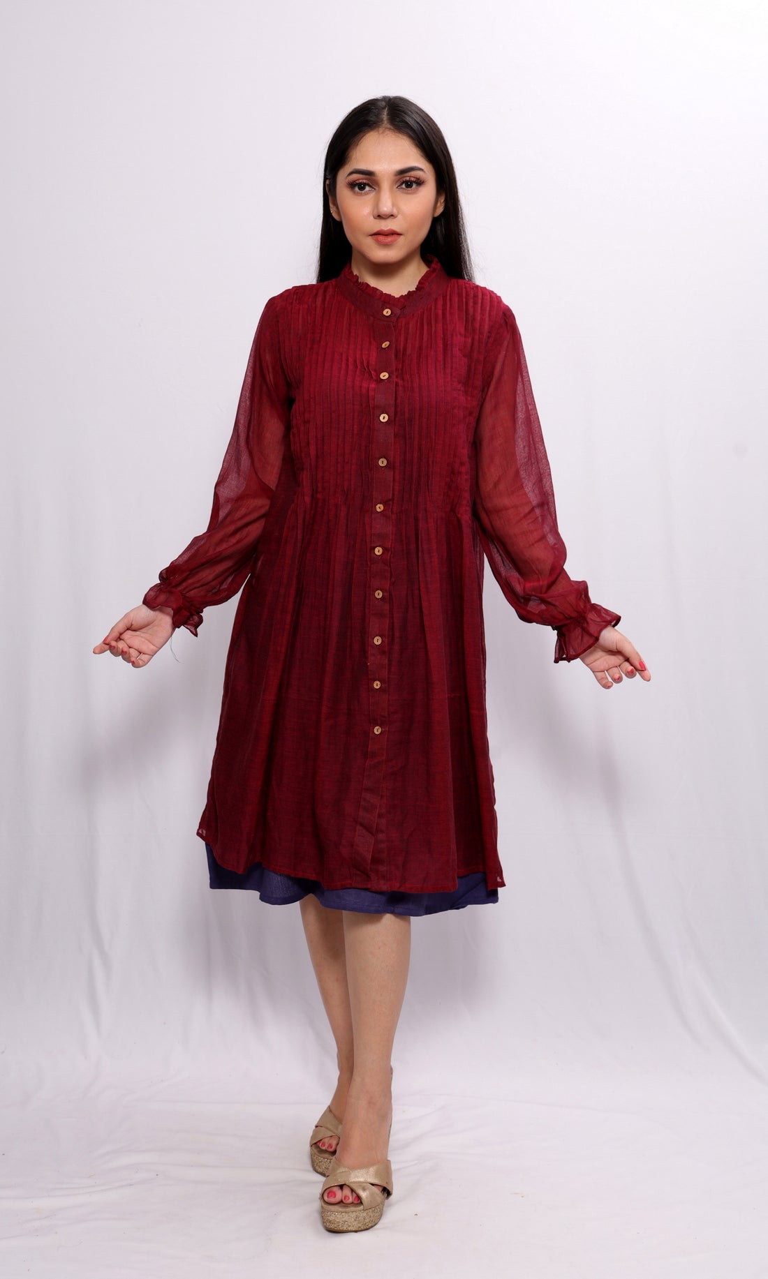 Marron transparent Ruffle Shirt dress with front and back pleats and wooden buttons. It has...