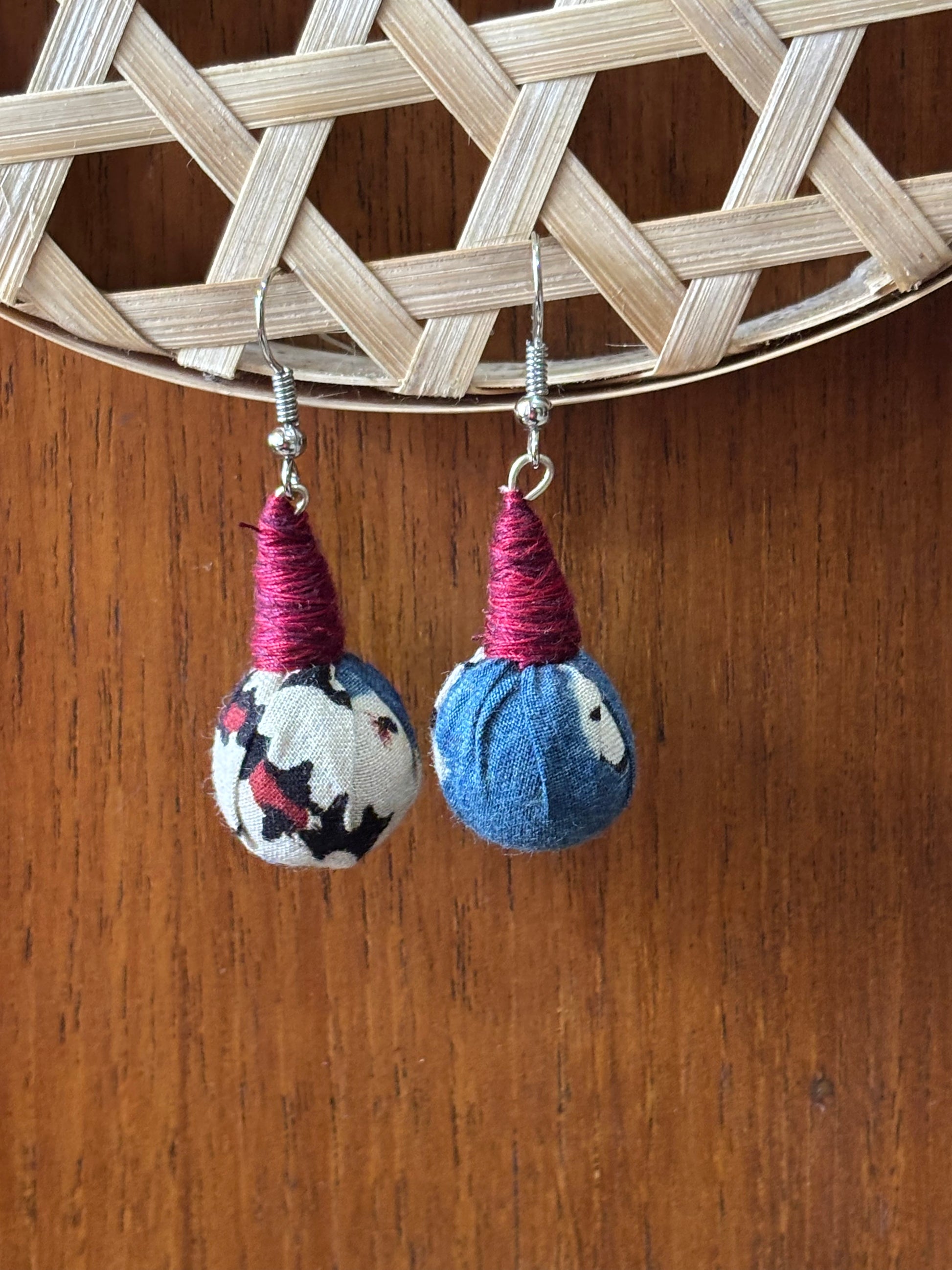 | Add a touch of subtle elegance to your look with our Ajrakh Drop Earrings, beautifully handcrafted using upcycled fabric. Designed with simplicity and charm, these earrings are perfect for everyday wear as well as special occasions. Made from authentic Ajrakh cotton fabric, the design features soft fabric beads in a soothing combination of indigo blue, off-white, and deep maroon accents. The top is neatly wrapped with thread detailing, giving it a refined handcrafted finish. Lightweight and comfortable, these earrings are easy to wear all day long, making them a perfect blend of style and sustainability. Each pair is uniquely handmade, celebrating artisanal craftsmanship |