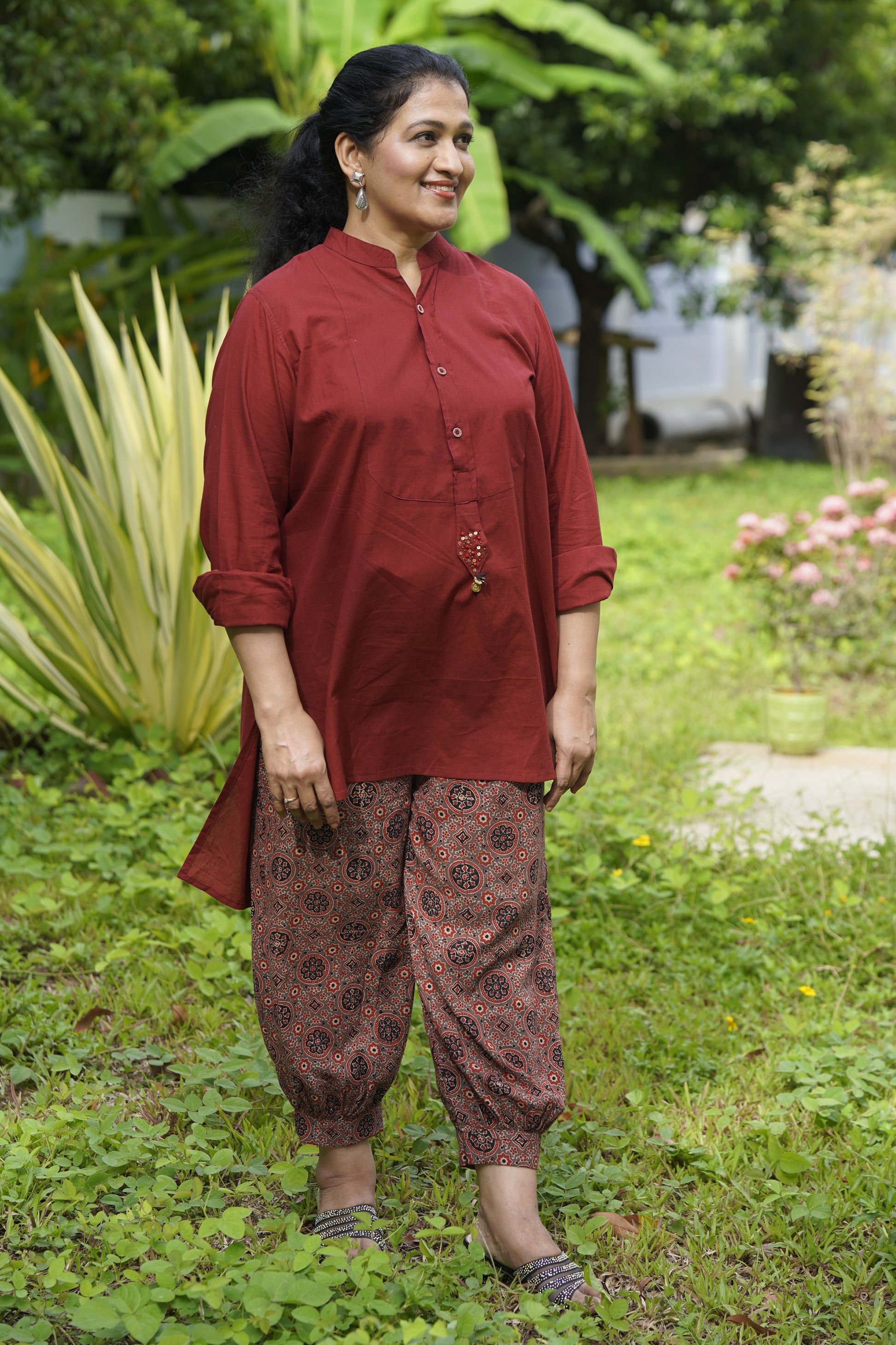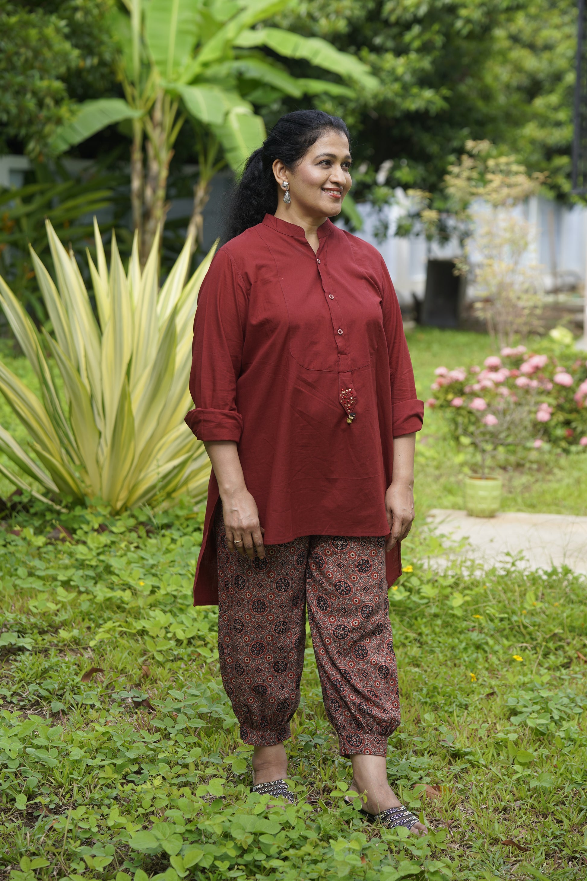 Crafted in soft, breathable cotton, this solid shirt-style kurta features a rich earthy tone with a clean, minimal silhouette. The mandarin collar and button-down front add a smart touch, while the relaxed fit ensures all-day comfort—perfect for everyday wear or work-ready styling.