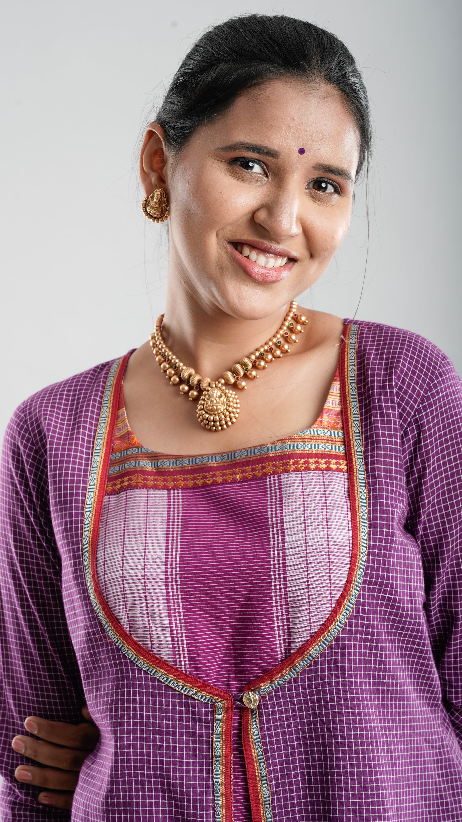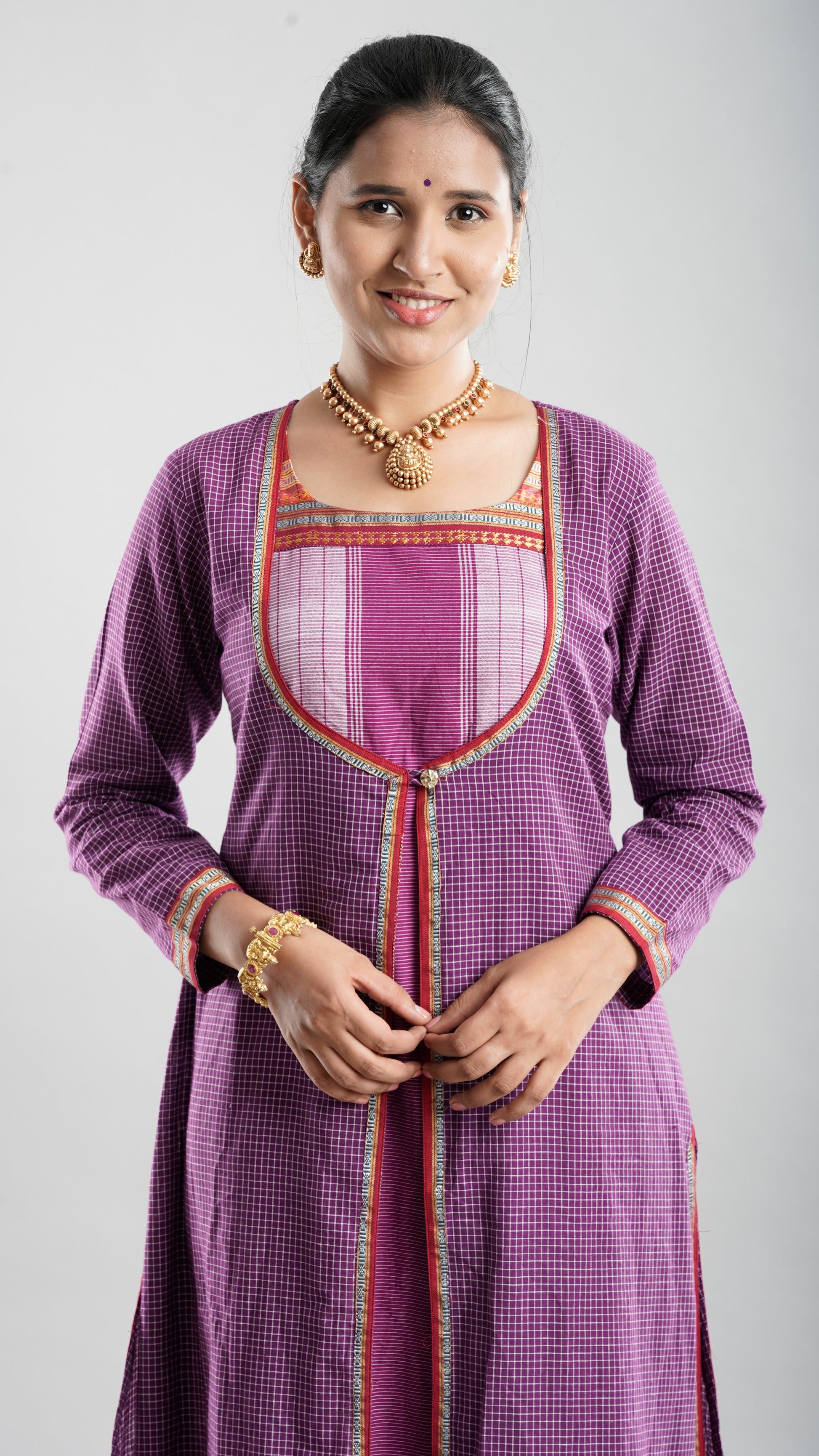 Step into tradition with our handcrafted piece made from traditional handloom Lugra fabric — a timeless weave known for its rich cultural roots and textured elegance. Woven by skilled artisans, this fabric features soft drape, breathable comfort, and a naturally beautiful aesthetic. Ethnic style Kurta in Purple color