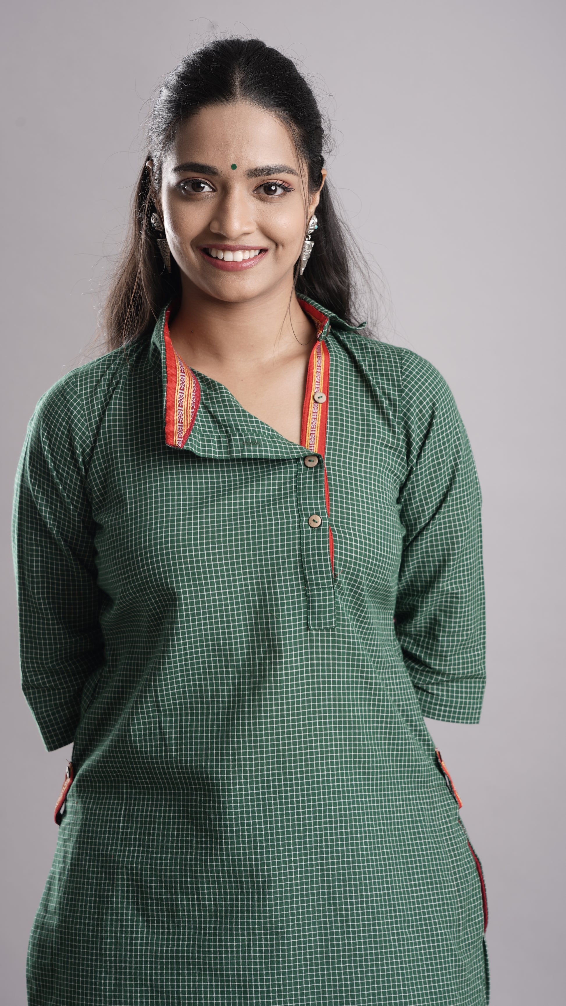 Celebrate comfort with culture in our "Hariyali Comfort" Handloom Cotton Patiala Set. Tailored in rich green handloom cotton with fine woven checks, this set features a smart kurta with a unique asymmetrical placket highlighted by a bright red contrast piping and collar detailing. The relaxed-fit Patiala salwar drapes gracefully, offering ease of movement while enhancing the traditional charm.